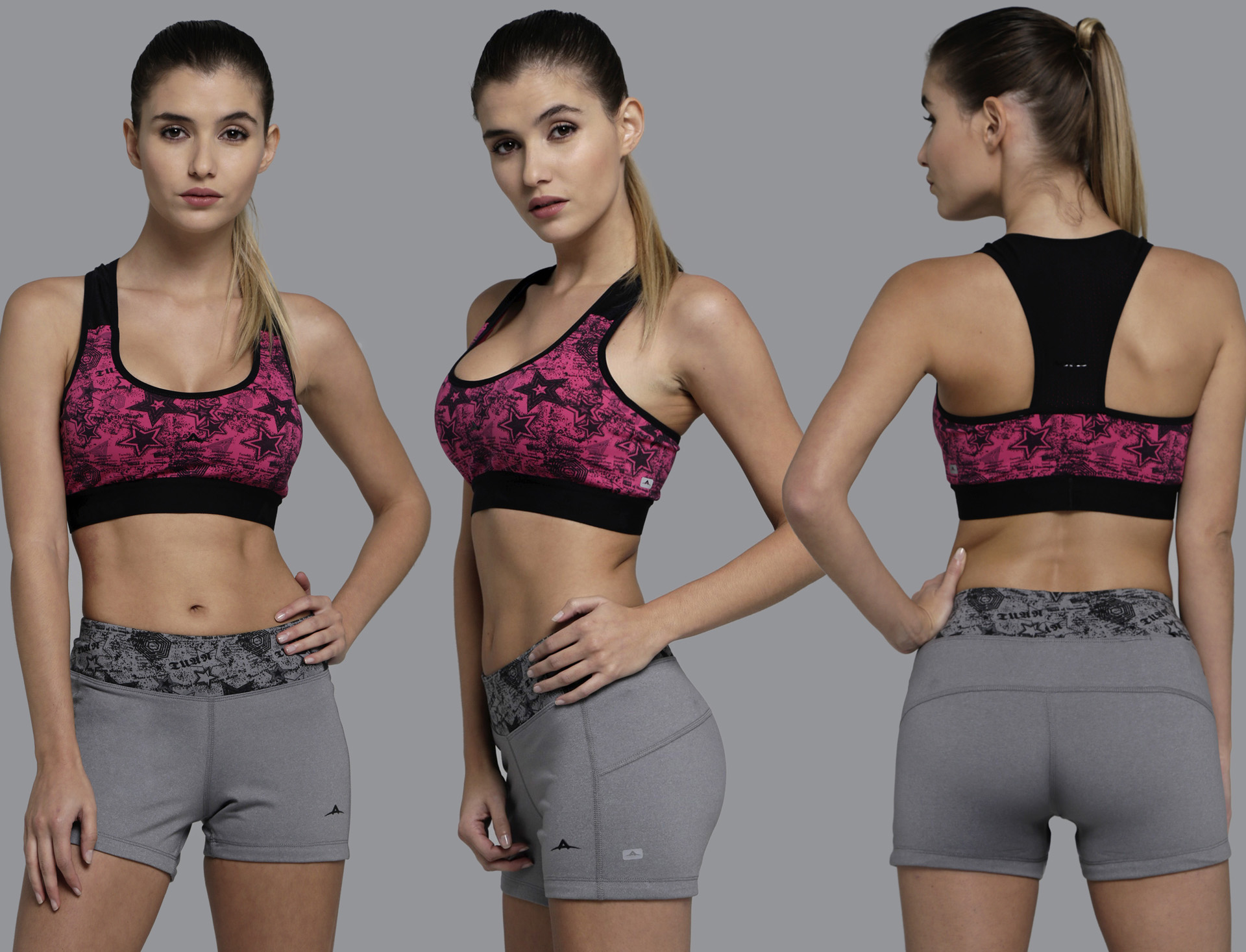 NYLON C/SPANDEX/ FANTASÍA · NYLON C/SPANDEX/ SUPPLEX Musculosa combinada con tela fantasía y detalles de costuras flatseammer · Short estampado con terminación en collareta y cintura de supplex negra.